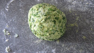 Mound the flour in the center of your work surface and make a well in the middle. Add the eggs and spinach. Use a wooden spoon to beat together the eggs and spinach. Then gradually start incorporating shallow scrapings of flour from the sides of the well into the liquid. As you work more and more flour into the liquid, the well’s sides may collapse. Use a pastry scraper to keep the liquids from running off and to incorporate the last bits of flour into the dough. Don’t worry if it looks like a hopelessly rough and messy lump.