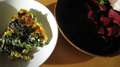 Heat 3 T of the olive oil in a heavy oven proof skillet. Add the kale and a splash of water. Cover and cook until wilty, about two minutes. When cooked, use the other 1 T of olive oil to coat the sides of the pan. Pour the egg mixture over the kale. Cook on low to medium heat without stirring until the egg starts to firm up around the edges.