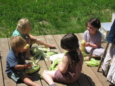 Then, bake it in the top two thirds of the oven for thirty minutes. While it’s baking, get the kids to shuck some corn.
