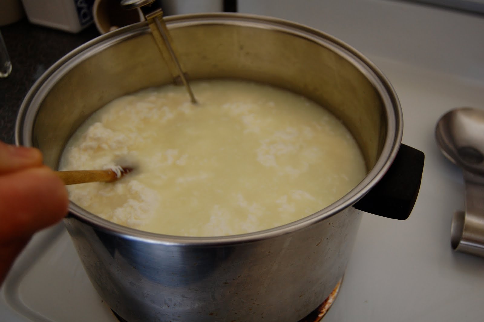 The materials that you will need are a large non-aluminum pot and a cheesemaking or candy thermometer. A candy thermometer doesn’t go quite low enough, but it helped me to approximate the temperature, and that seemed to be okay.