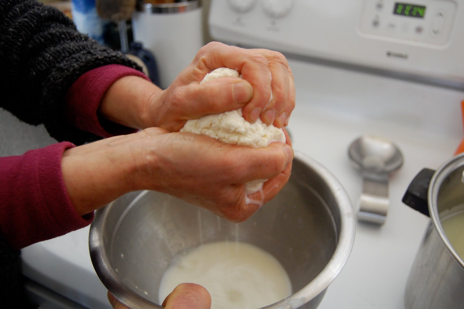 Remove it from the whey and knead the ball folding it over on itself. Try to get as much liquid out as you can. If you have sensitive hands, you might need rubber gloves at this point. Or like me, you might opt to burn yourself a bit so that you can experience the very exciting sensation of kneading cheese curds.