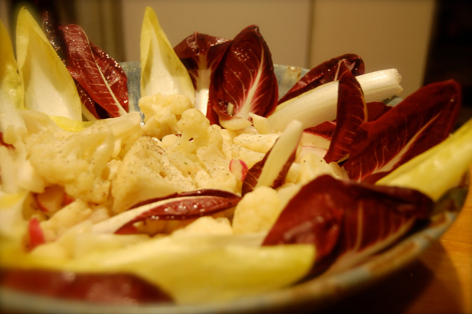 I made a little fancy winter salad, based off of a recipe that a friend passed on from Suzanne Goin. This is not a “Oh I need to eat plain celery all day because it’s the new year” salad. I’m voting for the eradication of those altogether. This is a salad that makes love to the vegetables within it, a salad to eat with your hands and let the bagna cauda drip down your arm. Think of it. A warm bath for you. Fabulous.