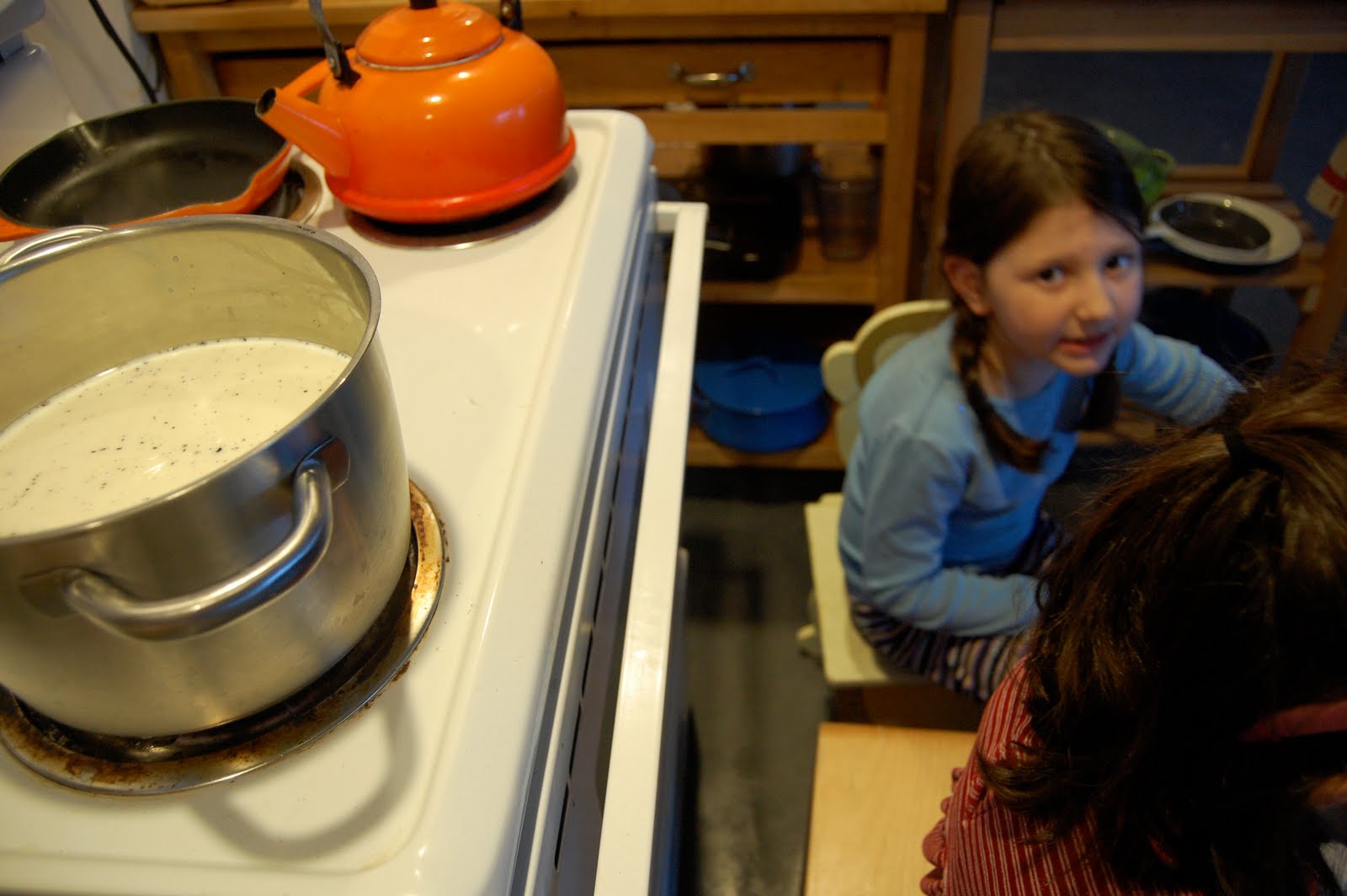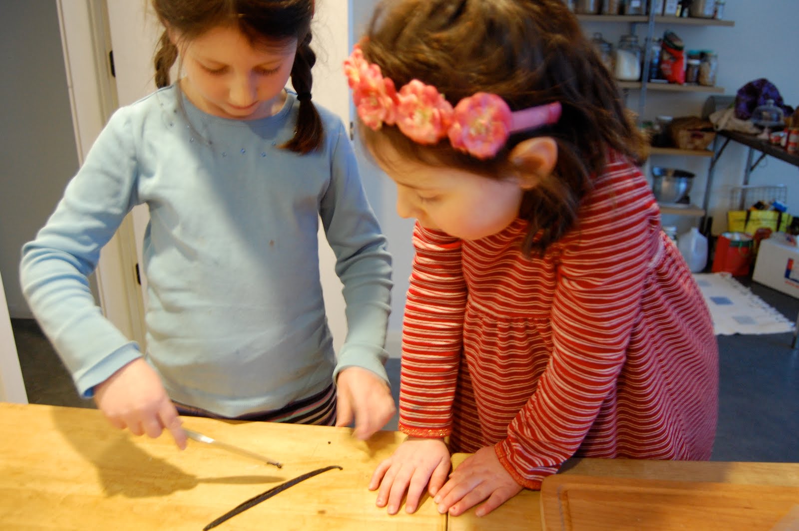 Then there was some very attentive scraping of vanilla beans. She didn’t get all those precious seeds out, but did I grab it from her to remedy the situation?