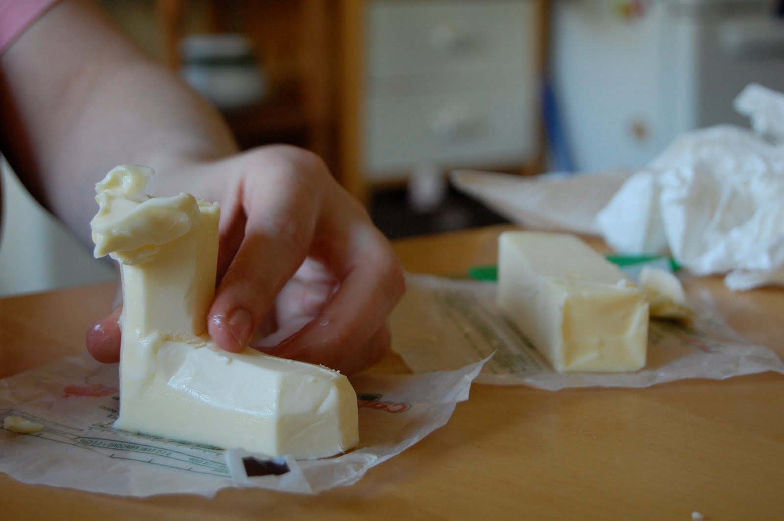 1. Start with one stick of butter in front of you. With the paring knife, draw three lines on the stick, dividing it into thirds. Cut one third off with the paring knife. This will be the head.