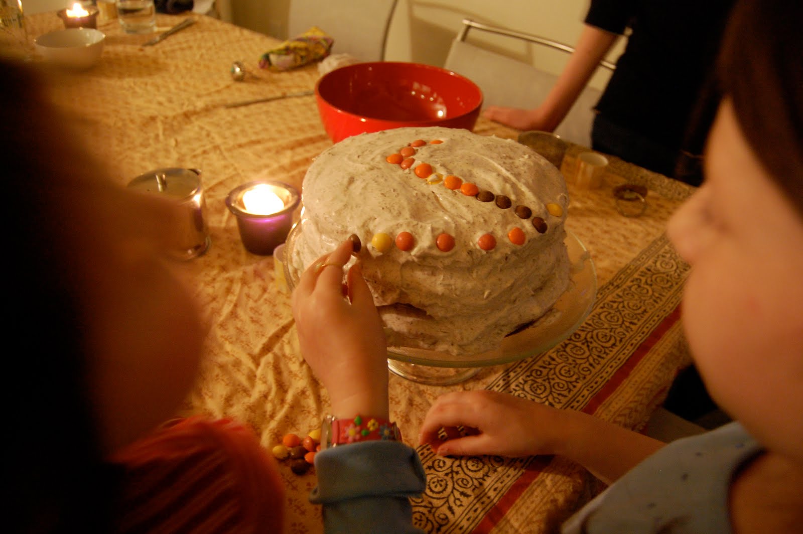 But that’s not the best one. For Sadie’s birthday, she requested a chocolate cake with whipped cream frosting. I made a mayonnaise chocolate cake (surprisingly ordinary!) and whipped a bit of raw cream for the filling. There were three layers, and the whipped cream didn’t quite hold it all in place.