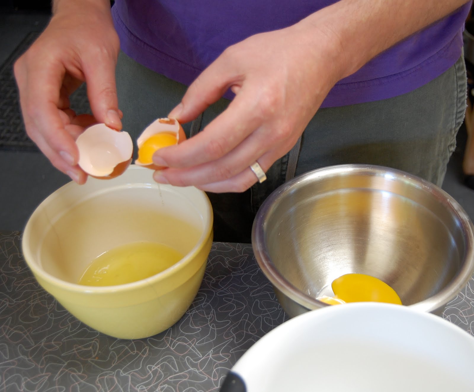 In a medium-sized bowl, whisk together the flour, sugar, baking bowder, baking soda, and salt. In a separate bowl, whisk together the egg yolks, milk, buttermilk, melted butter, and vanilla. Whisk the wet ingredients into the dry ingredients. The batter will be lumpy.