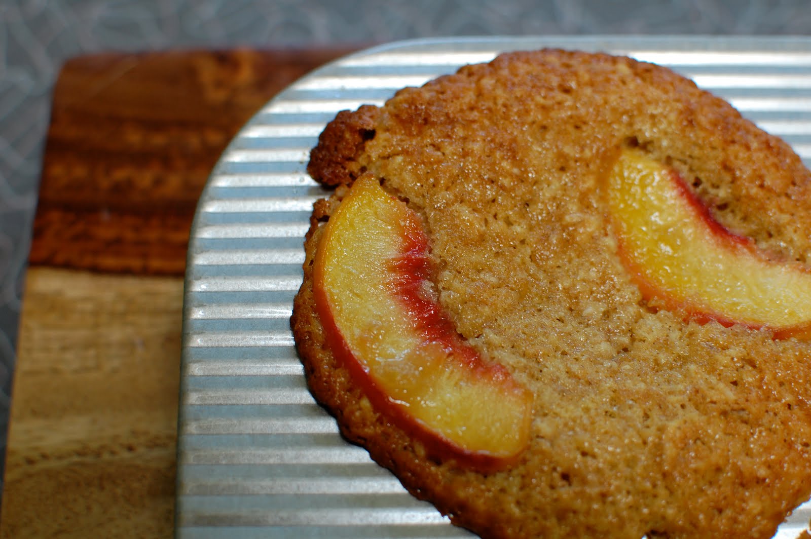 Fill each muffin cup so that it is slightly rounded over the top. Put two or three peaches on each muffin, pushing them into the center of each muffin as well. Bake for 25 minutes, rotating the pans half way through baking. Cool in the pans for five minutes before turning them upside down to remove muffins.