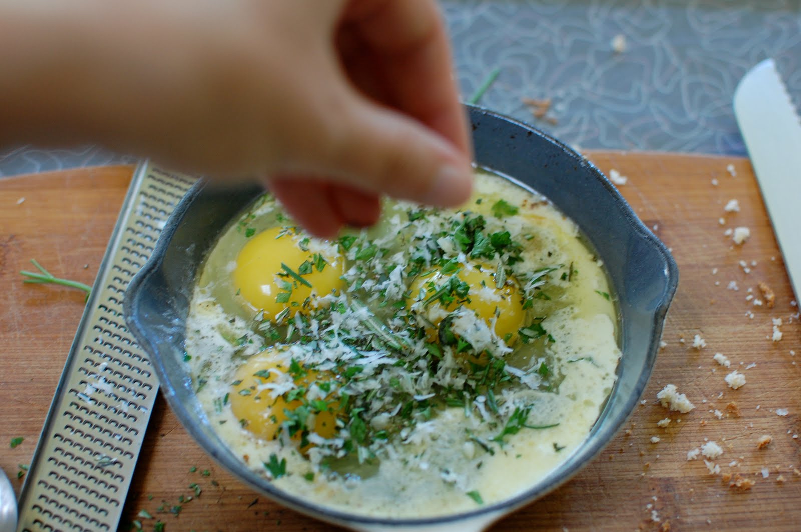 Preheat your broiler to medium high. In a small bowl, combine the herbs, parmesan, and garlic. Crack the eggs into a ramekin or tea cup. (They must be ready so that you can act fast). Put the butter and cream into a large ramekin, small gratin dish or other oven safe dish. Put the dish about six inches under the broiler until the butter and cream starts to bubble and sizzle. Watch it carefully–it will burn quickly. Remove the dish from the oven, and pour the eggs into the hot dish over the bubbling cream, taking care not to break the yolks. Sprinkle the herb mixture over the top, and add a bunch of salt and pepper. Put under the broiler and cook for 3-4 minutes, or until the whites are cooked but the yolks are visibly liquid.
