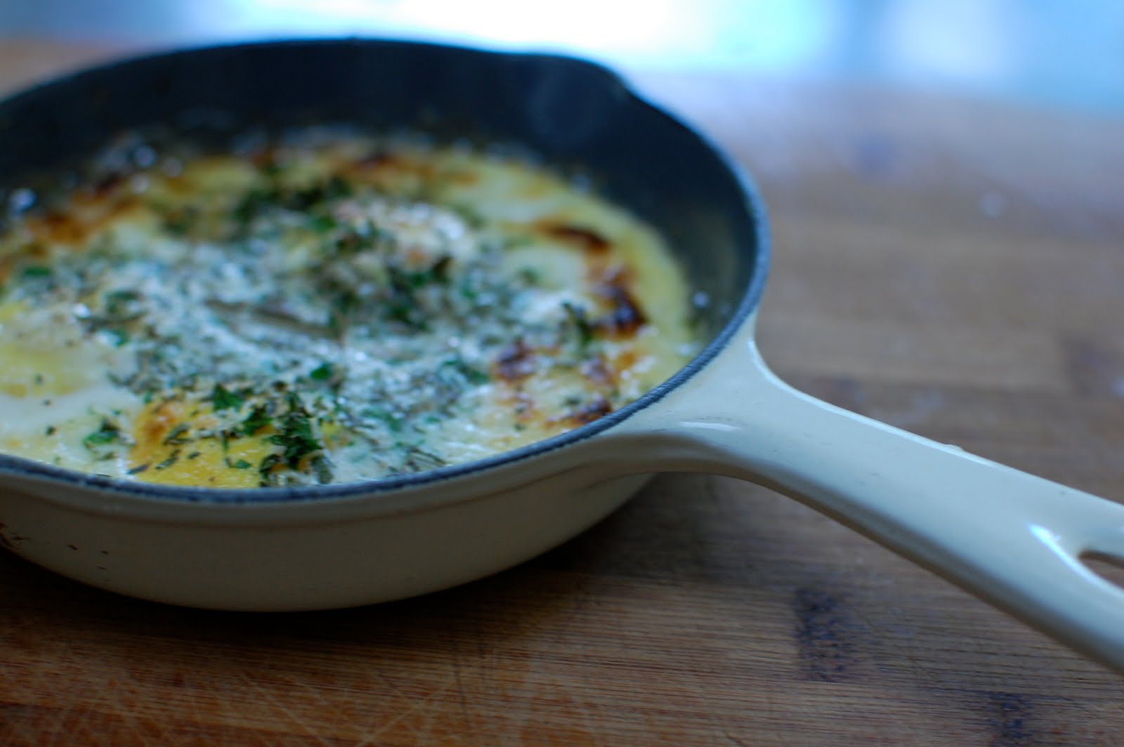 Well. You had me at "shirred eggs," and then it just kept getting better. How I wish I had an overgrown herb garden! (There is oh-so-much mint here, and little else.) And that wee cast iron pan is just perfect.