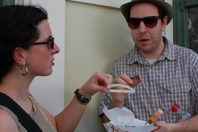 And so there we are, and it is Saturday. We’ve started our in depth perusal of the road food festival and there appears our friend Alice, who, superhero that she is, decided to fly standby from Providence so that she could spend four hours eating in New Orleans with us before getting back on a plane to go back to graduate school. This is Alice. I have known her for a long, long time, and she continues to surprise me in a good way.
