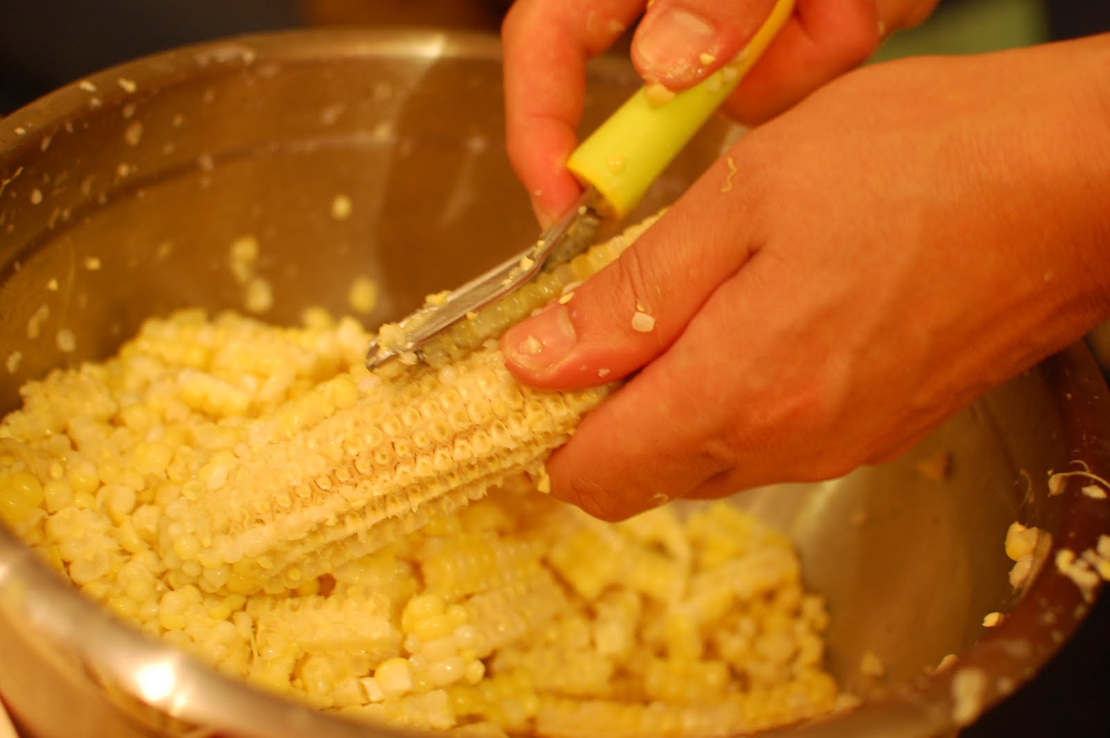 He used a little tool that I’d borrowed, an actual corn shucker. Pretty simple really, except that where a knife takes off most of the kernel and loses all that wonderful creamy juice, the shucker takes off the whole kernel. More corn. More cream. More delicious.