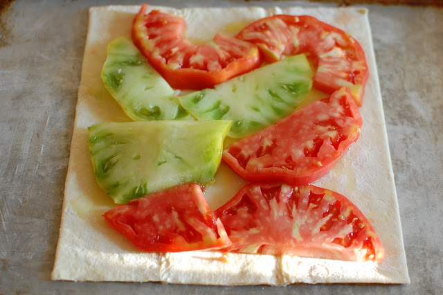 Of course, sometimes dinner actually has to be made, and the goal is some vehicle that can hold the produce that would normally get shoved in the mouth, juice running down the arm. Pasta always works, as does the trusty galette. Platter salads of any variety will will never get dull, as long as there is a mix of cooked and uncooked vegetables all tossed in a good vinaigrette. But a few weeks ago, Lissa brought a tomato tart to the little lake where we all swim. It was on puff pastry, and the tomatoes were thinly sliced so that they could dry out a bit. There were dallops of goat cheese throughout, and a few different herbs that I’m guessing she had on her counter. It was beautiful, and delicious, and when we oohed and ahhed over it, she said that of course it was easy, and that earlier that day she had started dreaming of it and she knew it was exactly what she wanted to make.