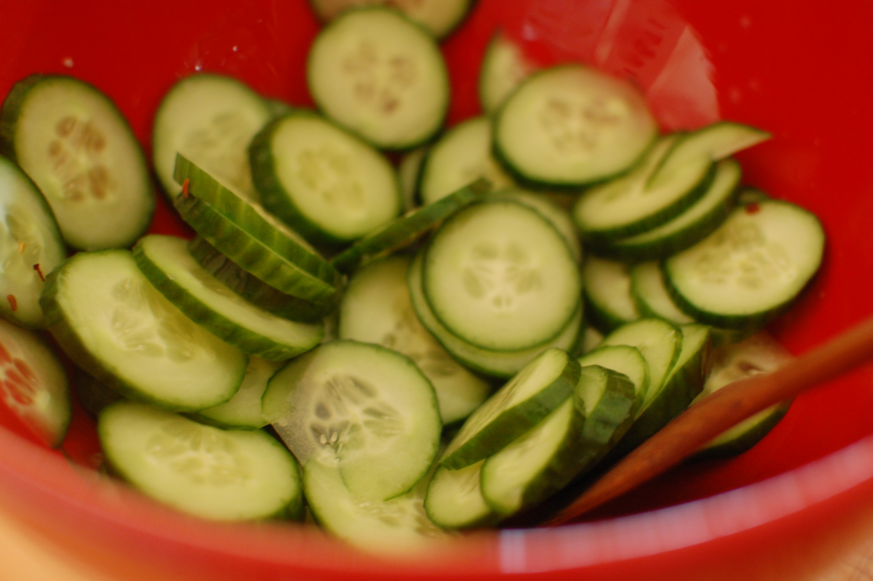 2. Meanwhile, combine the cucumbers, rice vinegar, red pepper flakes, and salt in a mixing bowl. Set aside.