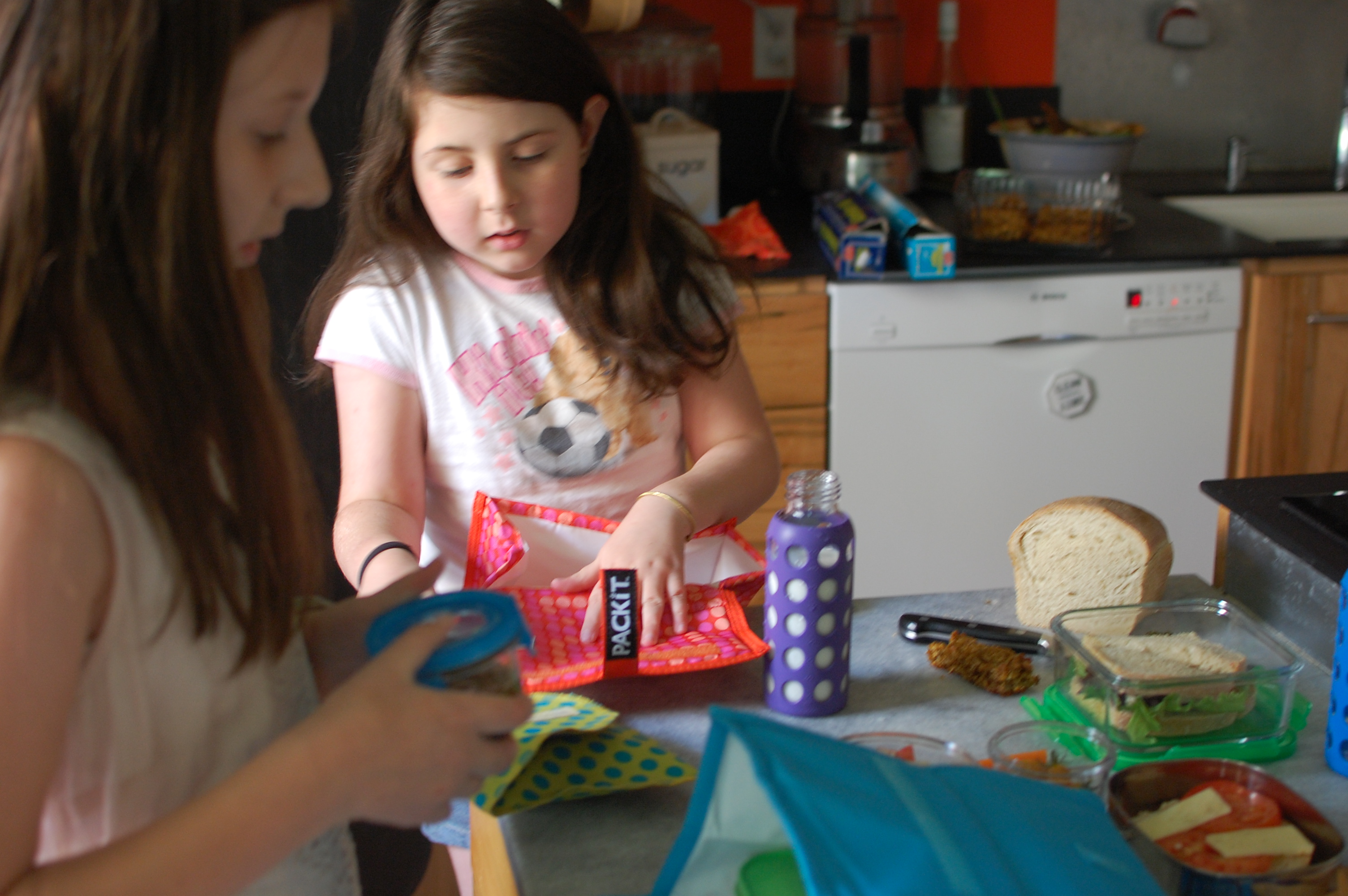 I took these pictures the other day. The girls put down their comic books and let go of being bored for a few minutes so they could pretend school had actually started. Rosie even put on clothes. And this–this scene of two peaceful girls and their dad happily packing lunches, sharing treats and homemade goodies? This is not actually what making lunch tends to look like in our kitchen. This is a set-up. Nice though, isn’t it?