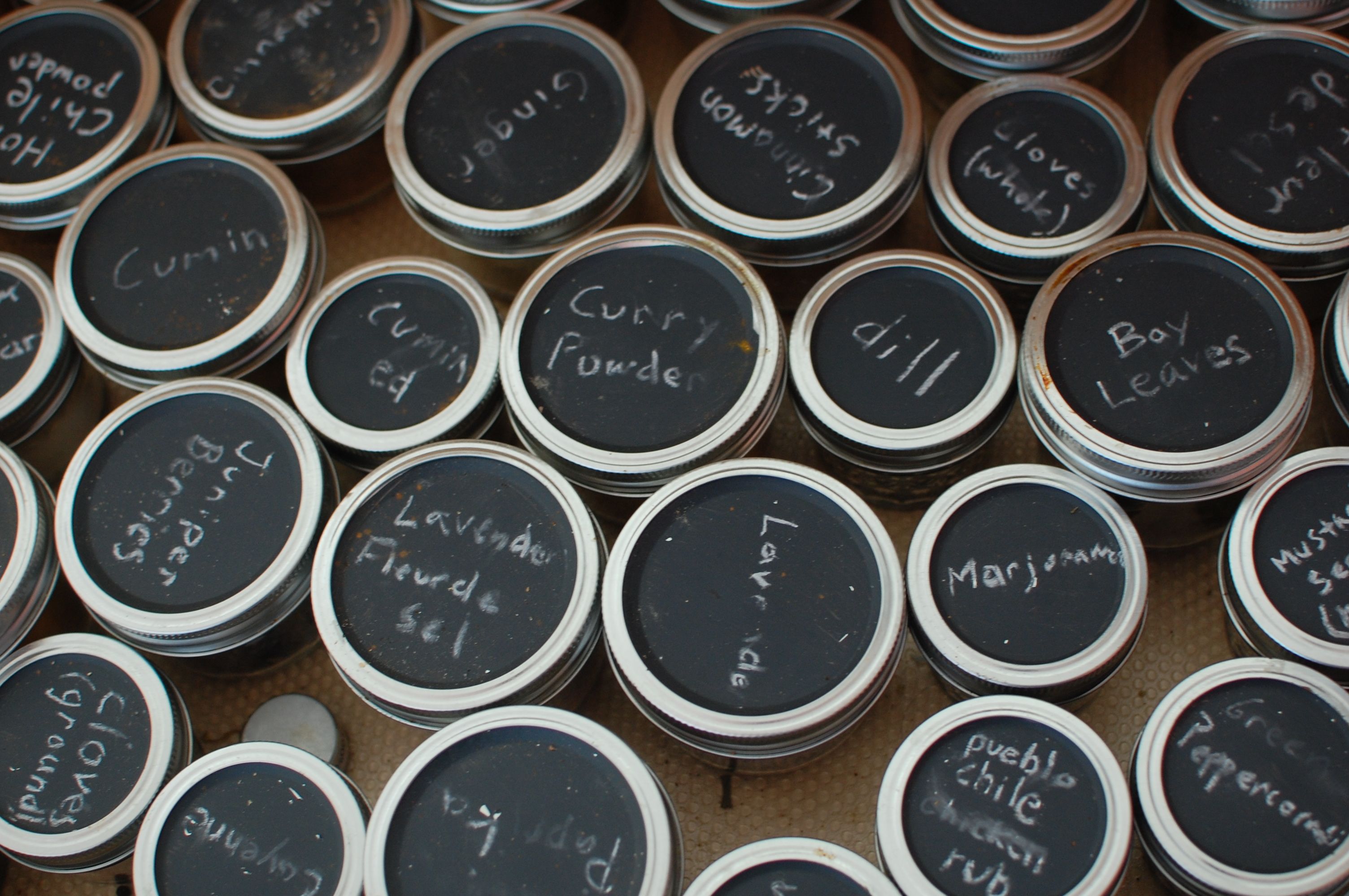 The second is the spice drawer. All spices are in 1/2-cup or low 1-cup mason jars, each with a lid painted with chalkboard paint (that’s all Joey). Ideally the jars would be alphabetized, but usually they’re not.